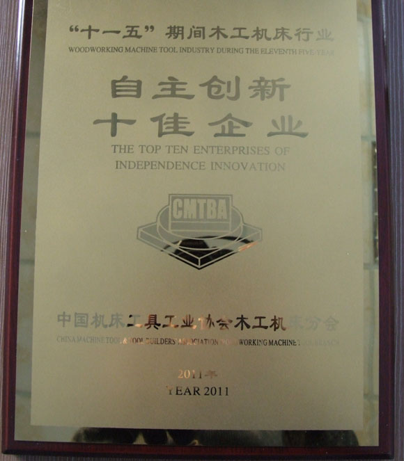 在中國機(jī)床工具工業(yè)協(xié)會(huì)木工機(jī)床分會(huì)的表彰大會(huì)上,公司被授予木工機(jī)床行業(yè)十一五“自主創(chuàng)新十佳企業(yè)”稱號(hào),公司董事長董延偉獲得中國木工機(jī)床行業(yè)“終身成就獎(jiǎng)”。